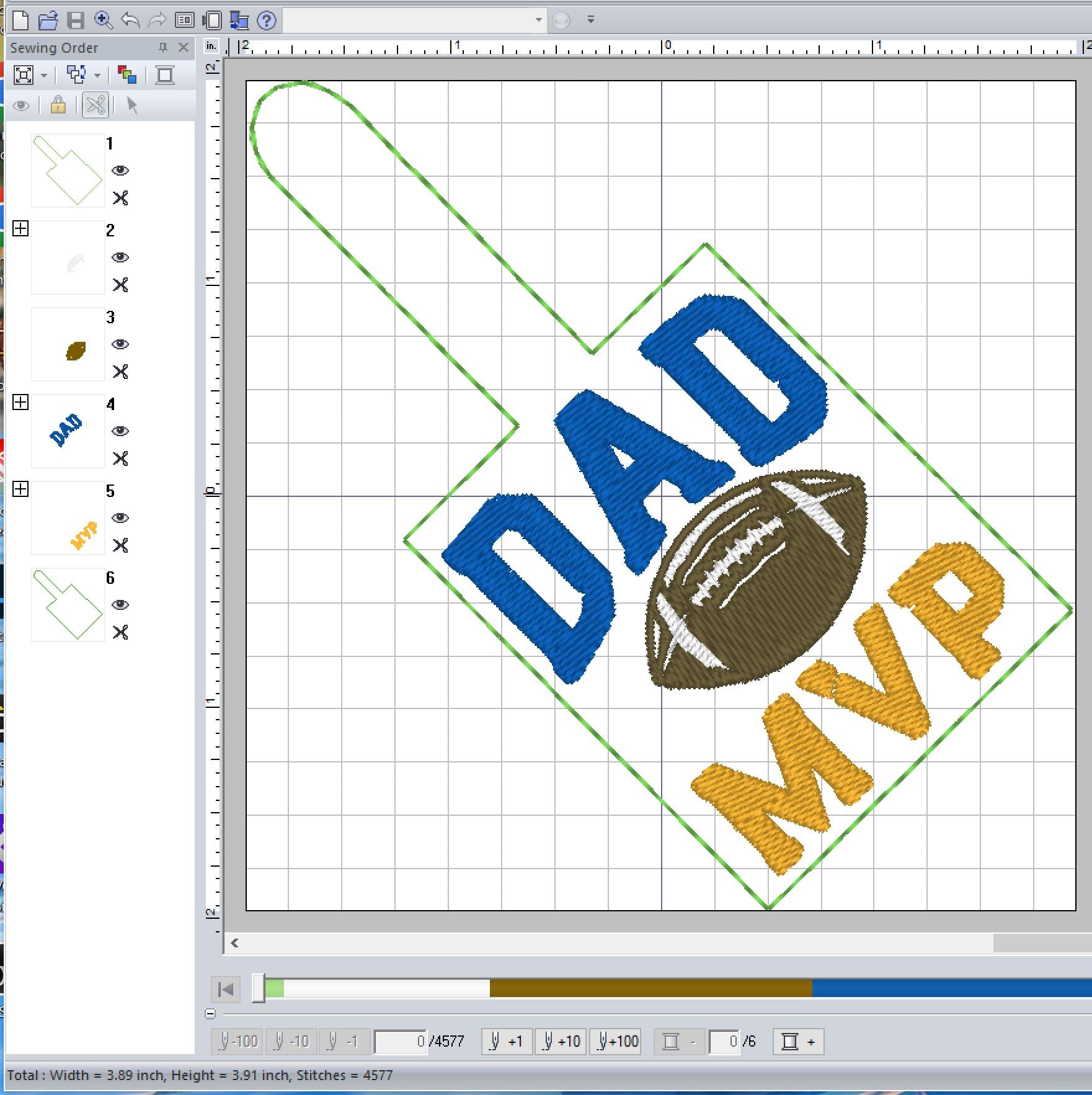 ITH Digital Embroidery Pattern for DAD MVP Football Snap Tab / Keychain, 4X4 Hoop
