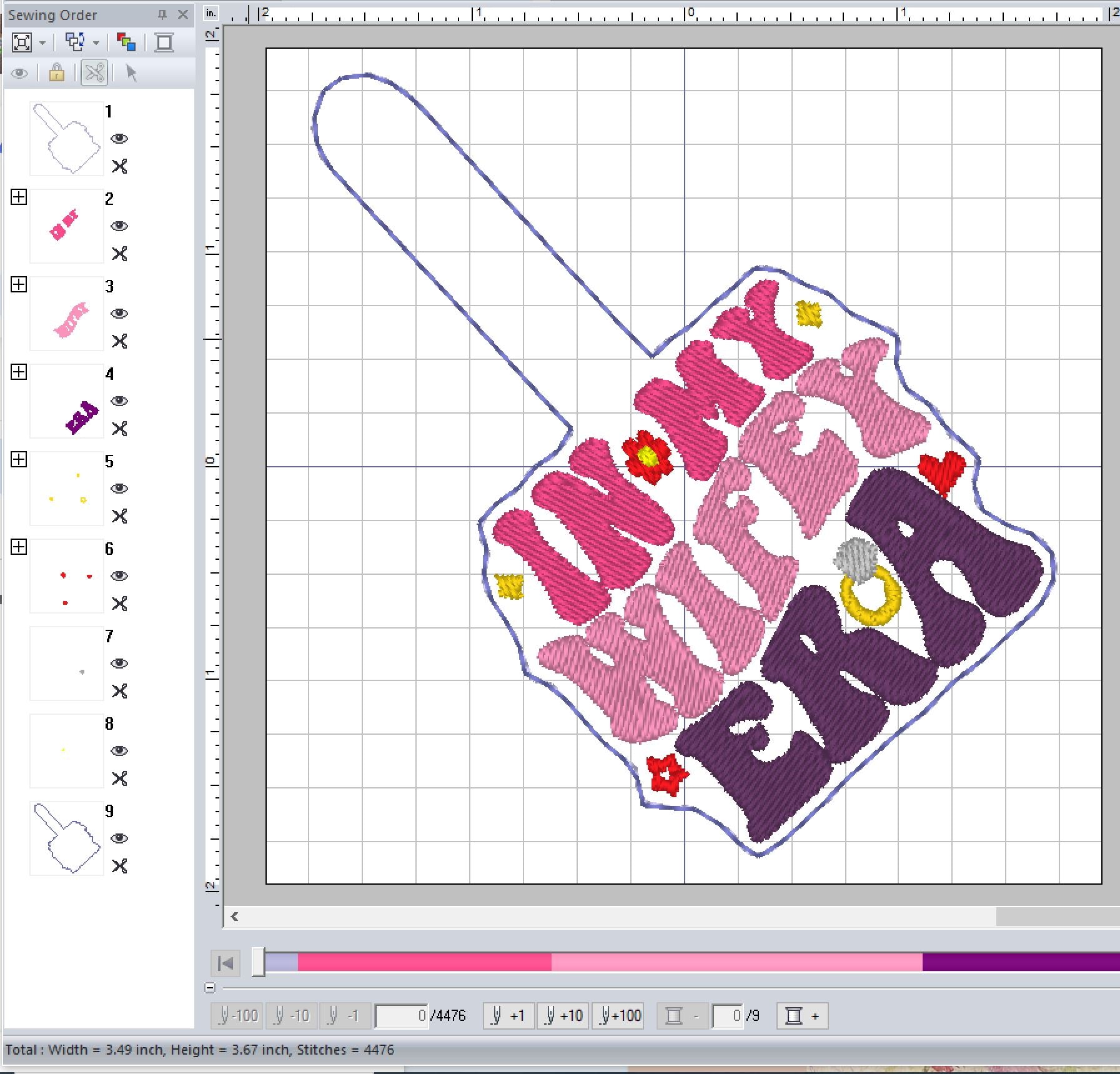 This pattern is 4X4 hoop friendly. This ITH design cannot be Split.