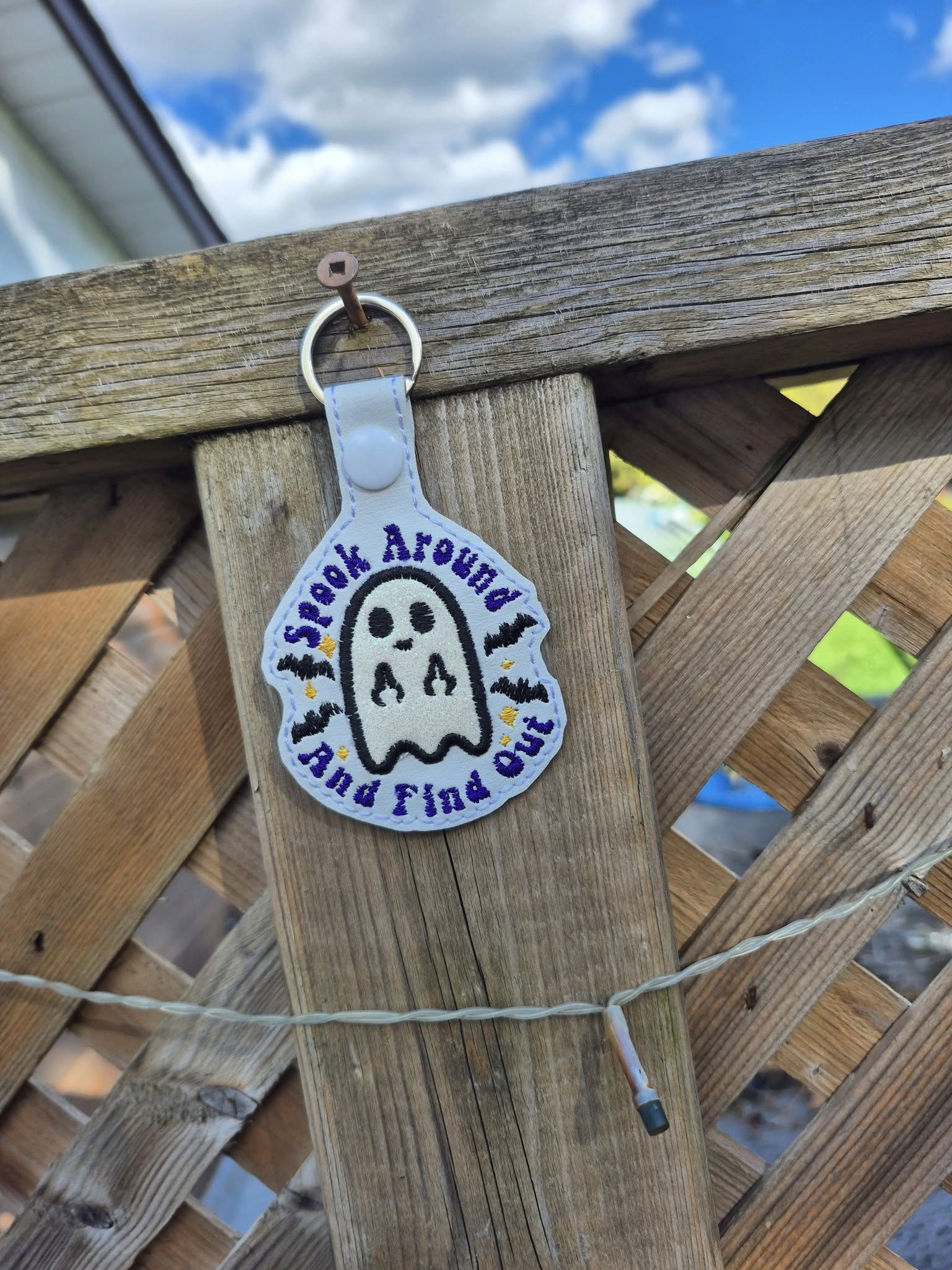 This is a Digital Pattern for Spook Around & Find Out Applique Snap Tab / Key Chain Embroidered Design.