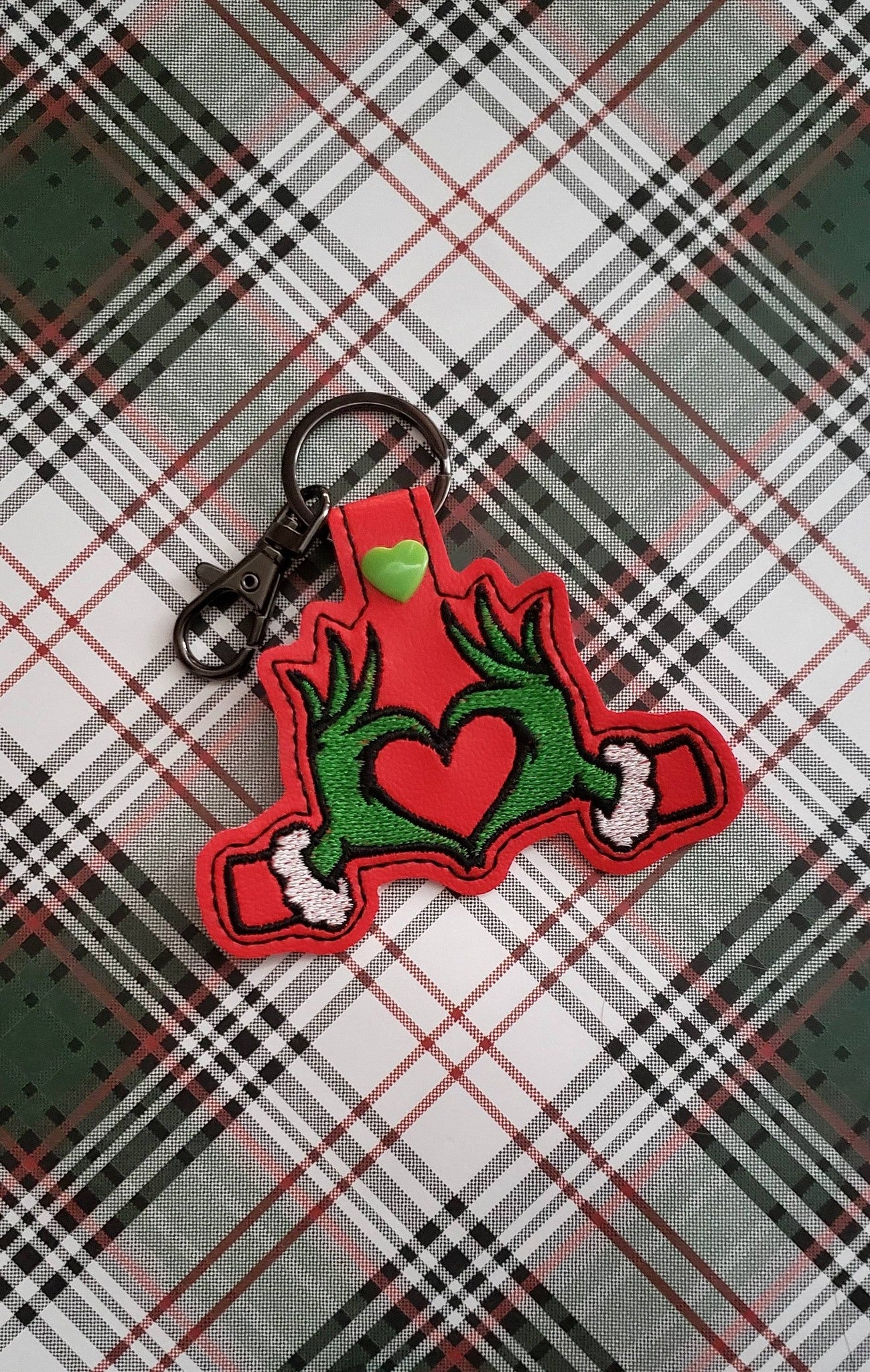 This is a Digital Pattern for Grinch Heart Hands Snap Tab / Key Chain Embroidered Design.
