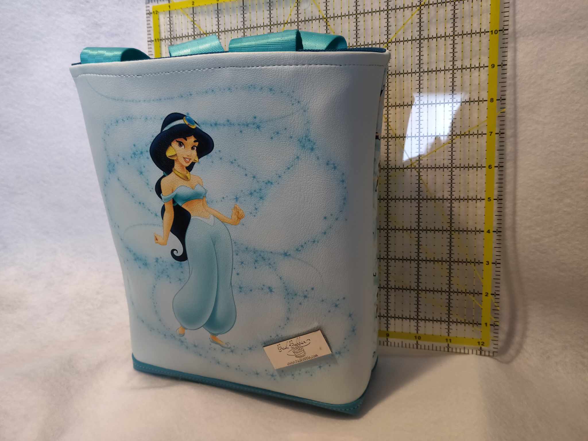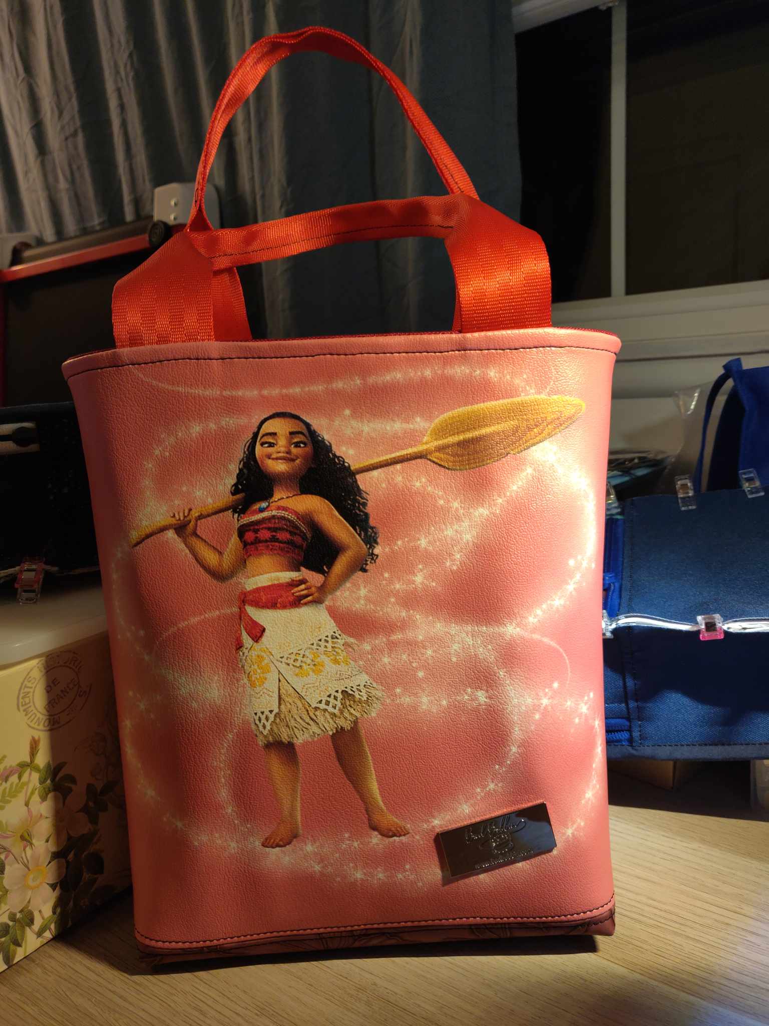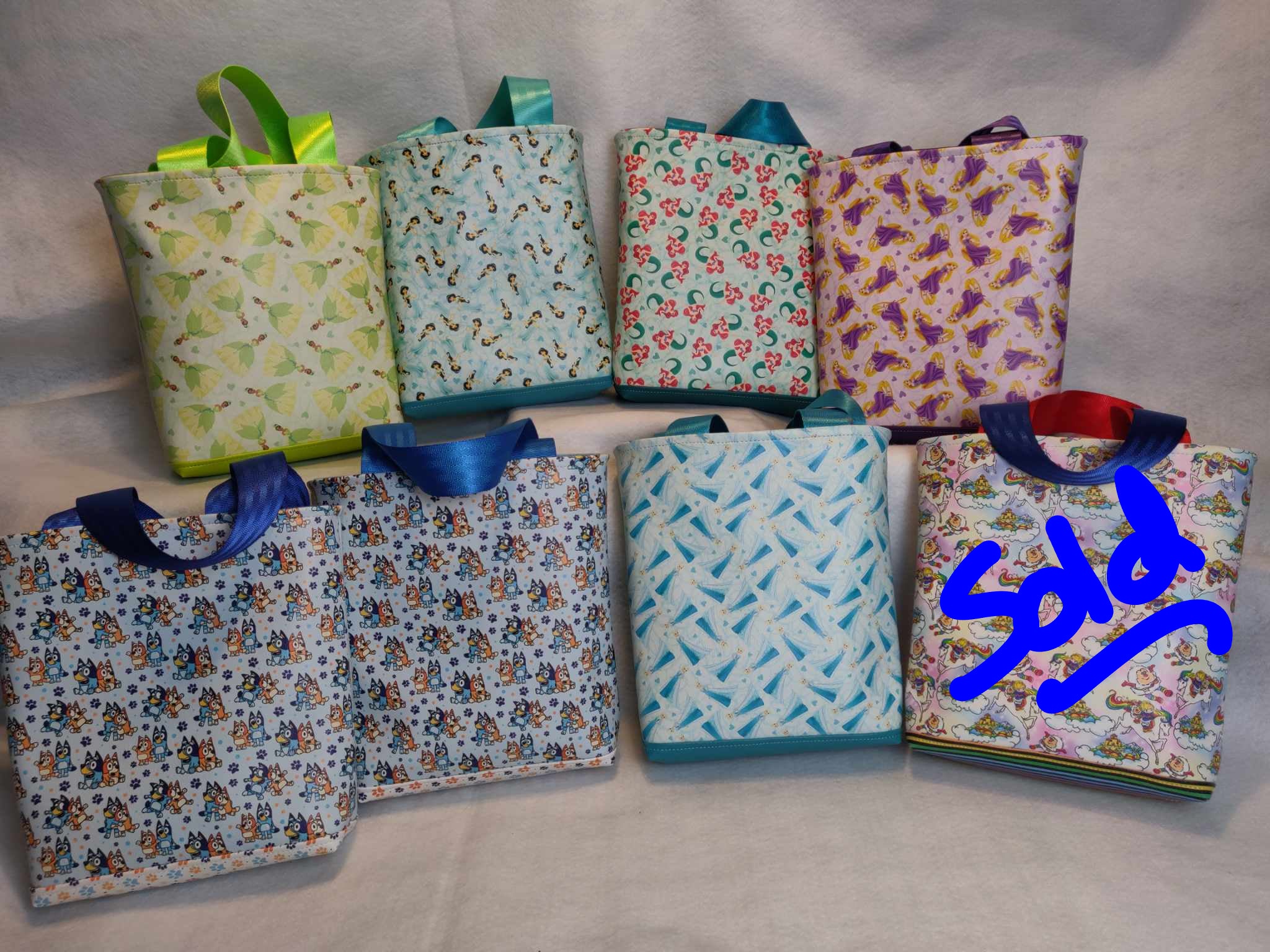 Medium size tote bag. Printed vinyl made in the USA. Waterproof Canvas Liner with inside slip pocket. Seatbelt webbing handles.
