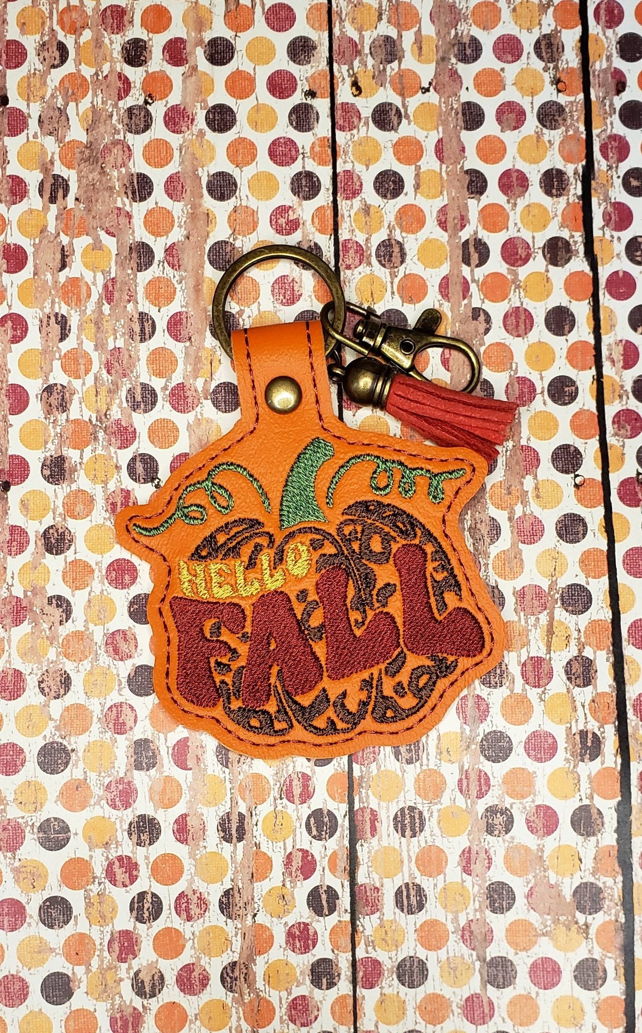 This is a Digital Pattern for Hello Fall Pumpkin Snap Tab / Key Chain Embroidered Design.