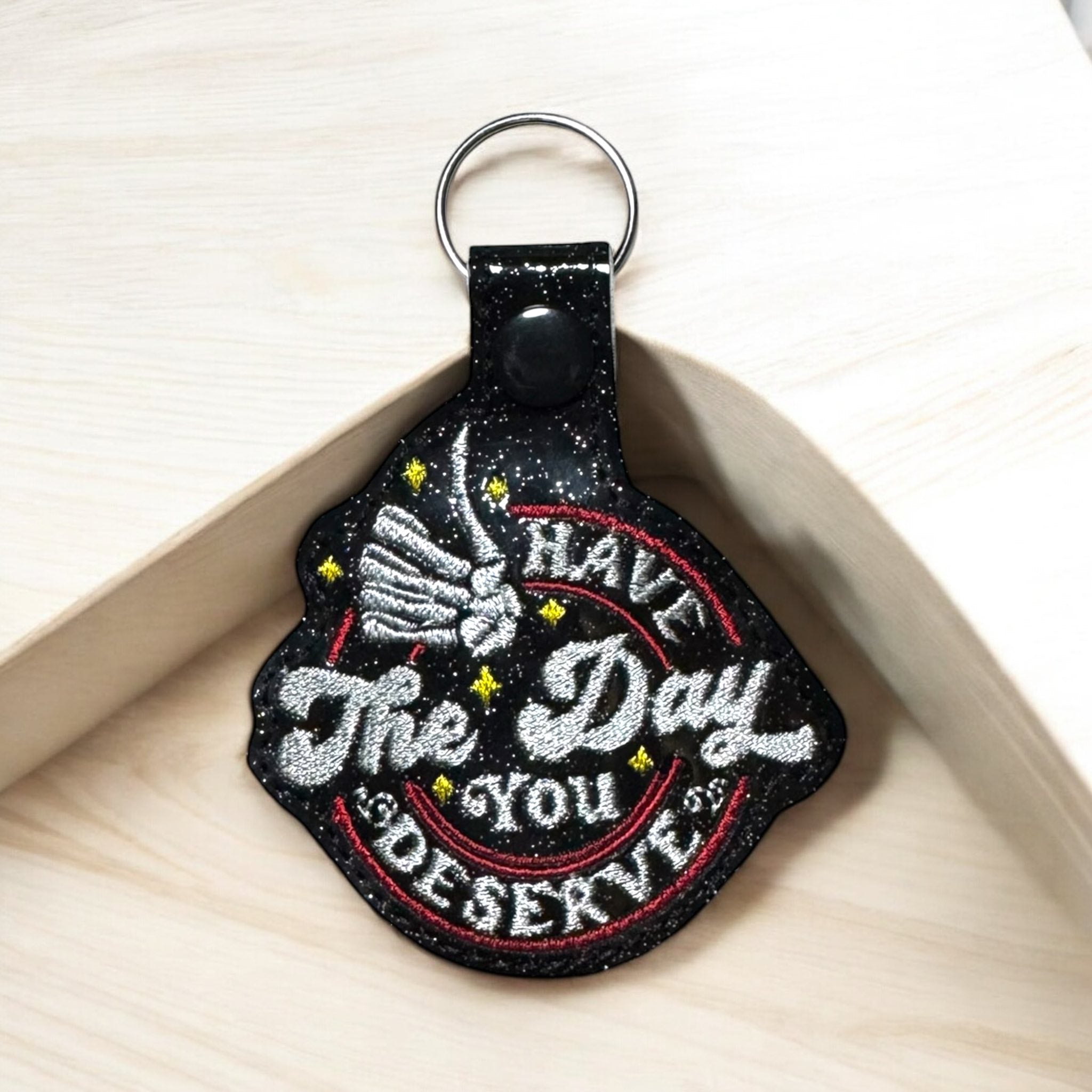 This is a Digital Pattern for The Day You Deserve Snap Tab / Key Chain Embroidered Design.